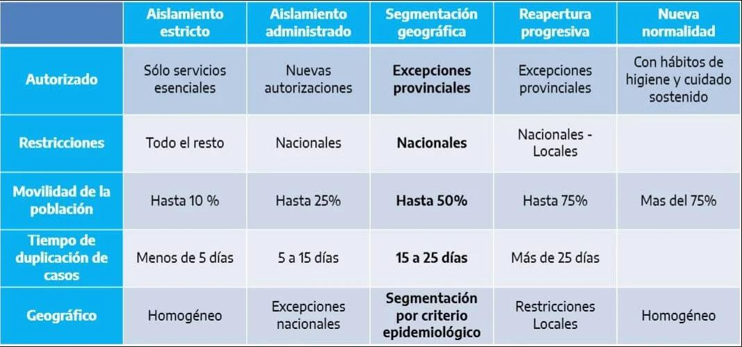 Al término del aislamiento "segmentado" habrá dos etapas más. La seguirá la “reapertura progresiva”: las actividades habilitadas continuarán dependiendo de las provincias, mientras que las restricciones se definirán a nivel nacional y local. La movilidad aumentará hasta el 75% y el tiempo de duplicación de los contagios superará los 25 días. La cuarentena tendrá un criterio más localizado.