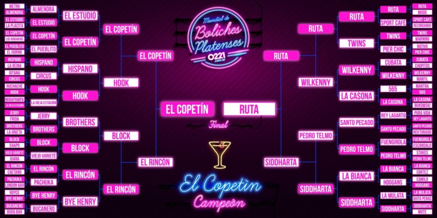 Durante días enteros varios miles de platenses coparon Twitter para recordar anécdotas, reír y abrazar amigos a la distancia, en medio del aislamiento social, preventivo y obligatorio al que nos empujó el coronavirus. El Mundial de Boliches Platenses organizado por 0221.com.ar llegó a su fin y fue un éxito. Contra todos los pronósticos, El Copetín se impuso ante Ruta Bacalao, un gigante de la noche de la ciudad que dejó su huella en varias generaciones de platenses; pero el mítico bar logró imponer su historia y sus fieles seguidores no dudaron en elegir esas paredes cargadas de camisetas, posters y miles de recuerdos.