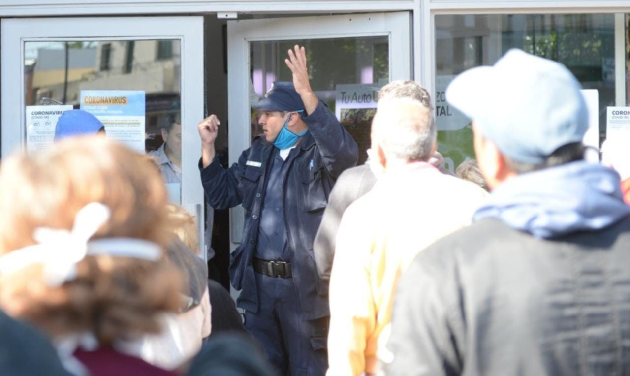 Pero el momento de mayor movimiento y descontrol, cuando se violaron todas las normas que impone el aislamiento, comenzó cuando se abrieron las puertas de los bancos. Mucha gente se agolpó frente a las puertas y a quienes se encargaban de la seguridad le costó establecer las pautas de organización.