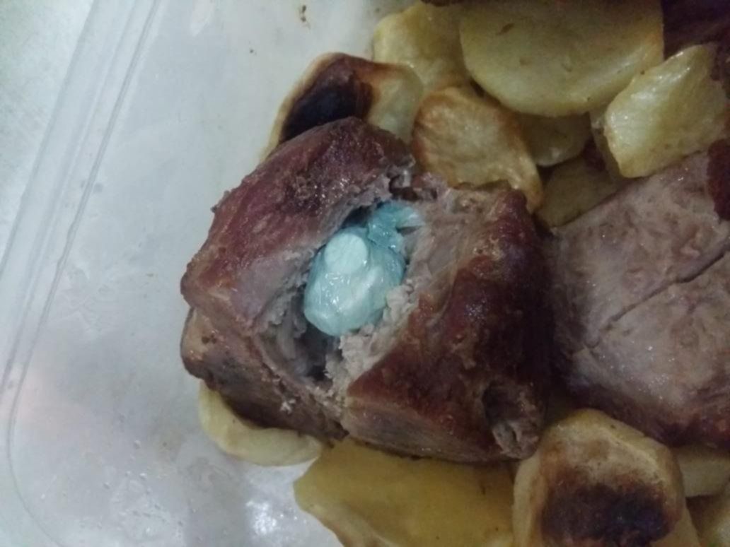 De esta forma, notaron que dentro de la bandeja -escondido dentro de un pedazo de carne- había un envoltorio de nylon con 29 pastillas de clonazepam.