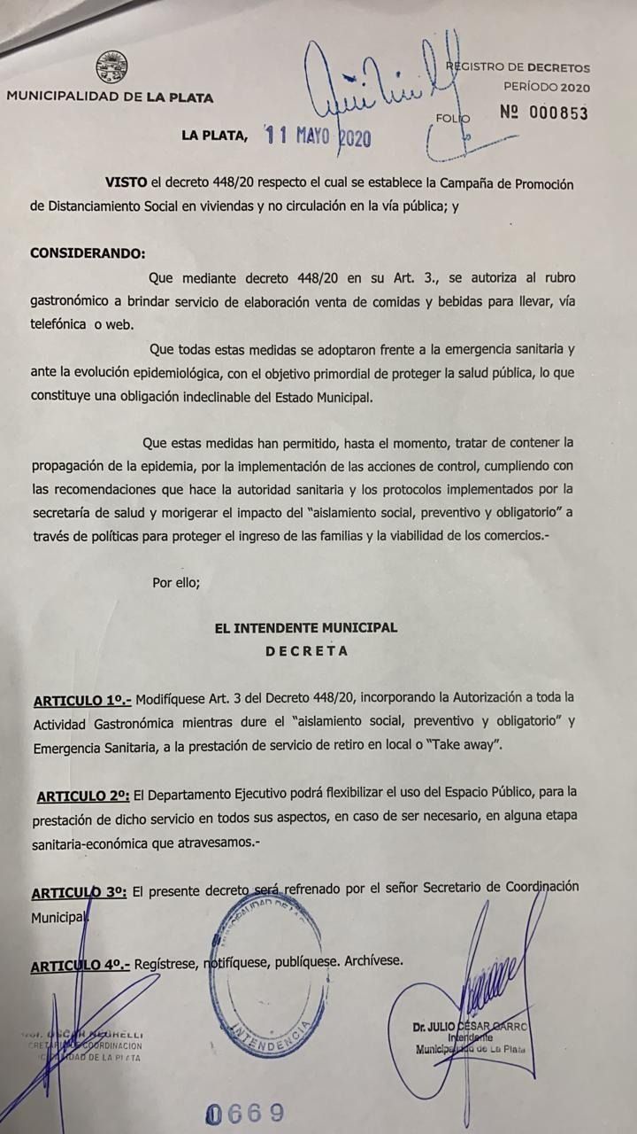 El intendente Julio Garro firmó este martes el decreto para autorizar la prestación del servicio take away para todas las actividades gastronómicas de la ciudad, mientras dure el aislamiento social, preventivo y obligatorio. Esta modalidad, que viene siendo implementada en Capital Federal, permite que los vecinos hagan pedidos de comidas y bebidas por teléfono o vía web y luego lo retiren en cada restaurante, bar o cervecería.