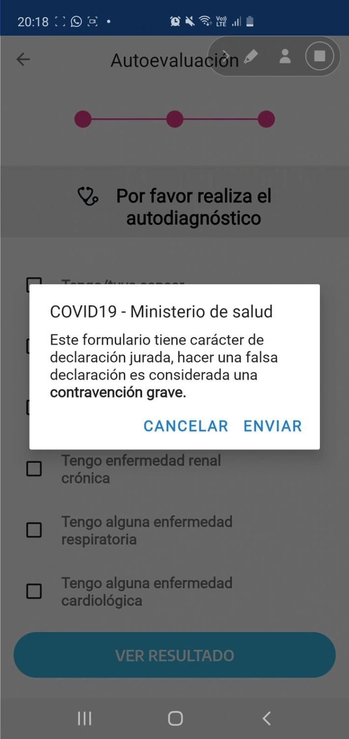 De ahí se pasa a otra pantalla donde consulta si se está transitando un embarazo; si tiene o tuvo cáncer así como diabetes, enfermedad hepática, renal o respiratoria. Una vez completa esa instancia, aparece un cartel donde se le recuerda al usuario que el formulario tiene carácter de declaración jurada y que hacer una falsa declaración es considerada una contravención grave. Después se debe presionar “enviar” y se verá el diagnóstico.