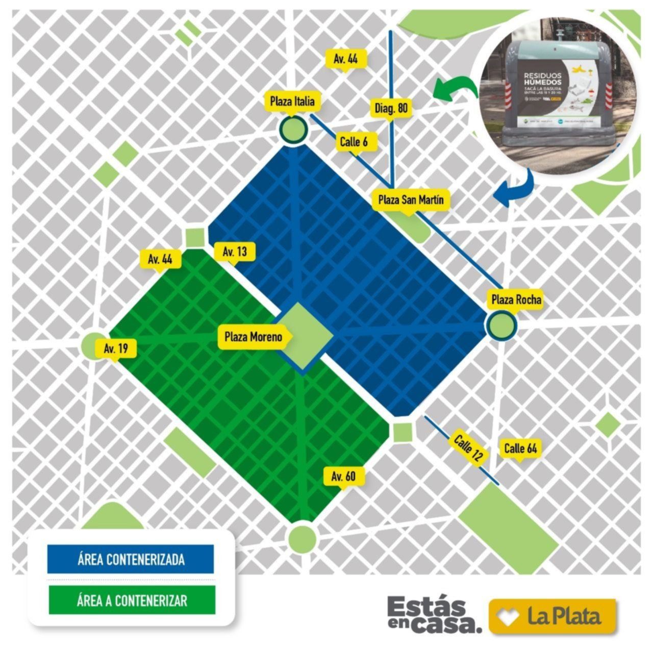En las primeras etapas del plan de gestión de residuos, el Municipio colocó 100 recipientes destinados a residuos húmedos en la zona triangular delimitada por: diagonal 74, avenida 51 y avenida 7, incluyendo parte de las plazas Italia, Moreno y San Martín; y otros 122 en calle 12 desde 54 a 64; en el territorio delimitado por avenida 7, diagonal 73 y calle 54, incluyendo parte de las plazas Rocha, Moreno y San Martín; en avenida 137 de 60 a 66, de Los Hornos; y en la cuadrícula conformada por las calles 2 y 4, de 528 bis a 531, en Tolosa.