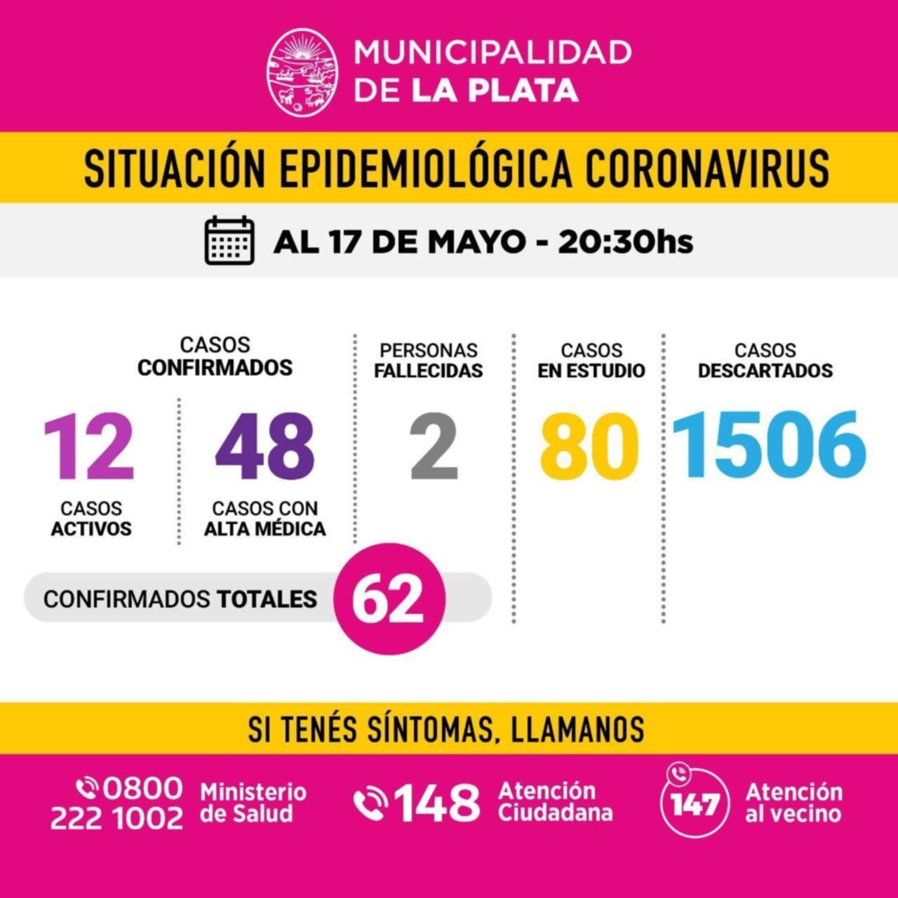 Este domingo fue otra jornada en la que no se registraron nuevos casos por COVID-19 en la ciudad, por lo que el total de contagios se mantiene en 62. Lo informaron las autoridades del área de Salud de la Comuna y, al mismo tiempo, aseguraron que tampoco hubo nuevas muertes en las últimas 24 horas. En total, en el transcurso de la semana, se diagnosticaron ocho casos: cinco mujeres y tres hombres.