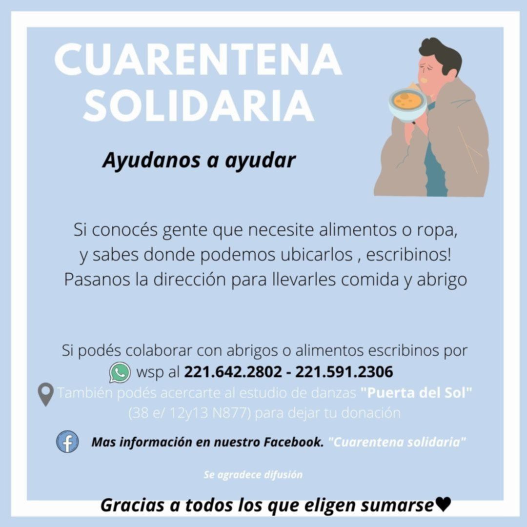 Quienes puedan ayudar, deben comunicarse al 221-642-802 o al 221-591-2306. Este grupo de amigos contaron que sirven todo tipo de alimentos como arroz, fideos, salsas de tomate, legumbres, etcétera.