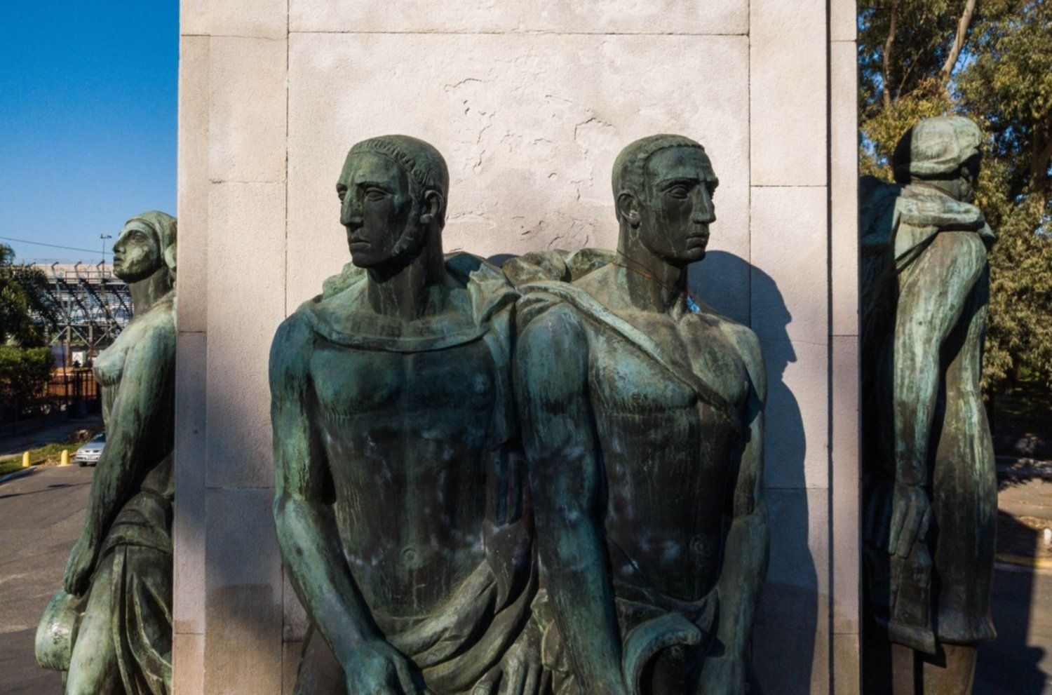 La obra es del artista plástico Alfredo Bigatti. Son cuatro caras que personifican las facetas de la actividad pública del ex presidente argentino: legislador, militar, historiador, poeta y presidente.