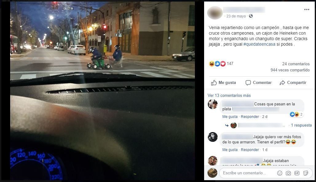 "Venía repartiendo como un campeón , hasta que me cruce otros campeones, un cajón de Heineken con motor y enganchado un changuito de super. Cracks jajaja, pero igual #QuedateEnCasa si podes", escribió una vecina que se los cruzó en 29 y 44.