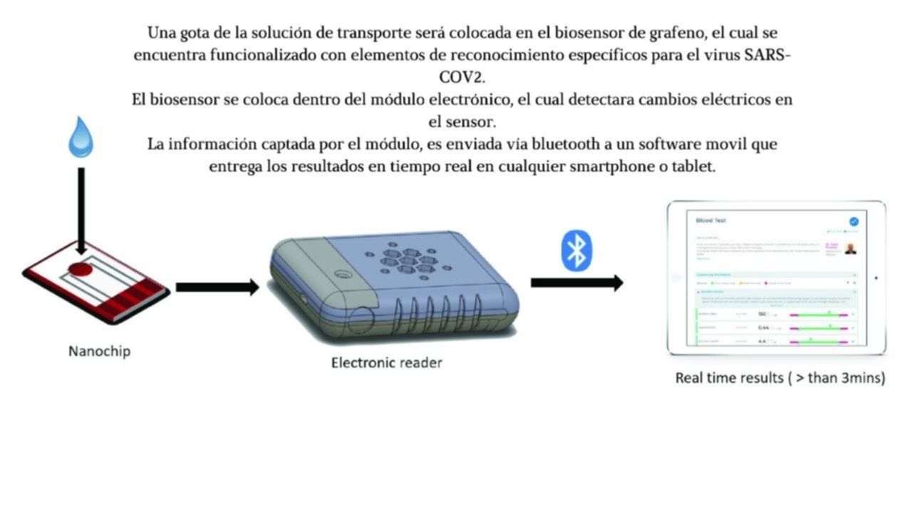 En cuanto al funcionamiento del equipo, los directores de la iniciativa detallaron que primero se tomara un hisopado nasal para screening en pacientes asintomáticos. El hisopo se coloca en un tubo con una solución de transporte. Una gota de esta solución se pone en el biosensor de grafeno, el cual se encuentra funcionalizado con elementos de reconocimiento específicos para el virus SARSCOV2. El biosensor se coloca dentro del módulo electrónico, que detecta cambios eléctricos en el sensor y la información captada por el modulo es enviada vía bluetooth a un software móvil que entrega los resultados en tiempo real en cualquier smartphone o tablet.