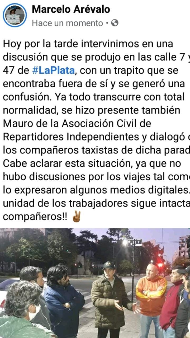 Más allá de las distintas versiones, lo cierto es que dirigentes que representan a los taxistas, como Marcelo Arévalo del gremio "de calle 43" y Mauro López, el titular de ACRE (la asociación de repartidores), se juntaron para cerrar la disputa y aclarar las circunstancias. El corolario fue una foto conjunta.