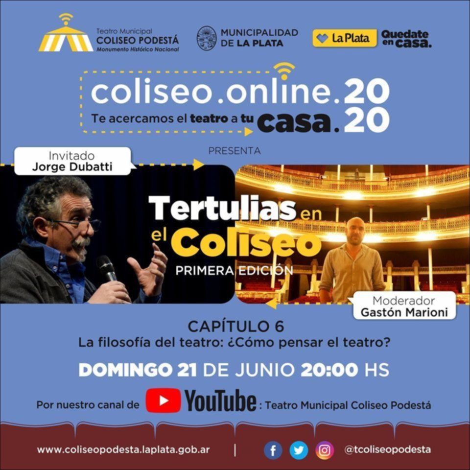 Este domingo 21 de junio, a las 20 horas, se emitirá otro capítulo de las “Tertulias en el Coliseo Podesta”. Jorge Dubatti será el invitado a conversar sobre “La Filosofía del Teatro: ¿Cómo pensar el teatro?”.
