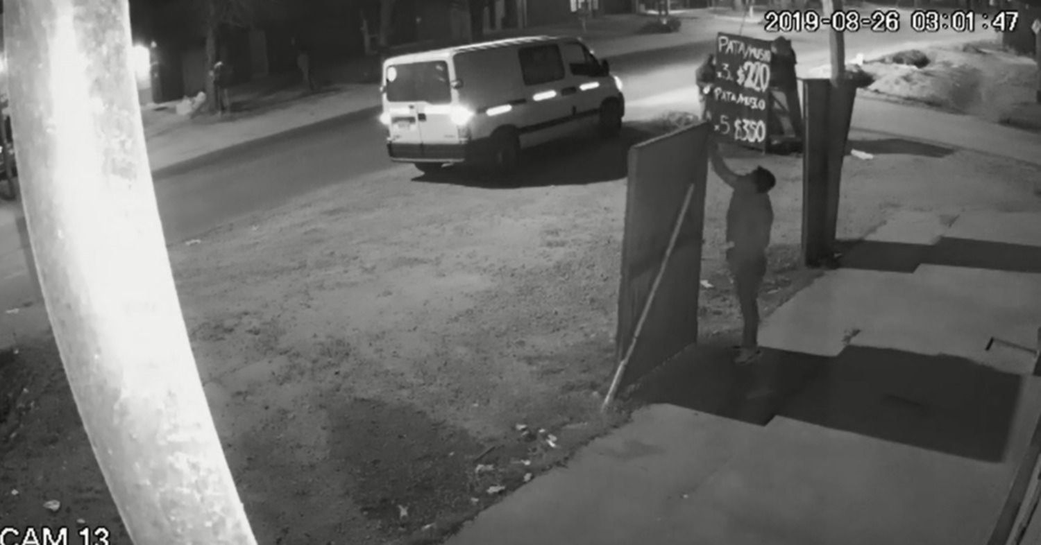 Según puede observarse en las imágenes, el implicado se apoderó de una pizarra de precios ubicada en la vereda para llevársela a pie. La labor le tomó apenas unos segundos, en los cuales aflojó la estructura y la sustrajo sin que nadie se diera cuenta.