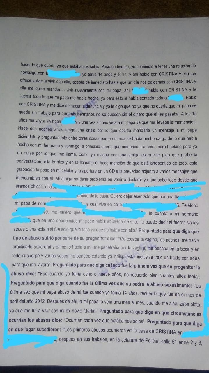 Pero según la joven platense esa casa no fue en el único lugar en el que el uniformado se aprovechó de sus hijas. “A mis 12 y a los 13 de mi hermana, mi mamá nos empieza a mandar con él porque ‘nos portábamos mal’, así que él nos empieza a llevar a sus trabajos. Íbamos con él a Jefatura (de Policía) y ahí también abusaba de nosotras. Íbamos al 911 y ahí lo mismo”, detalló y sostuvo que en una de esas oficinas hasta las hizo mirar videos pornográficos. La violencia sexual era constante y también se extendía a la guardia y en la Maternidad del Policlínico San Martín y en el Hospital de Niños Sor María Ludovica, donde R.A.P hacía horas adicionales.