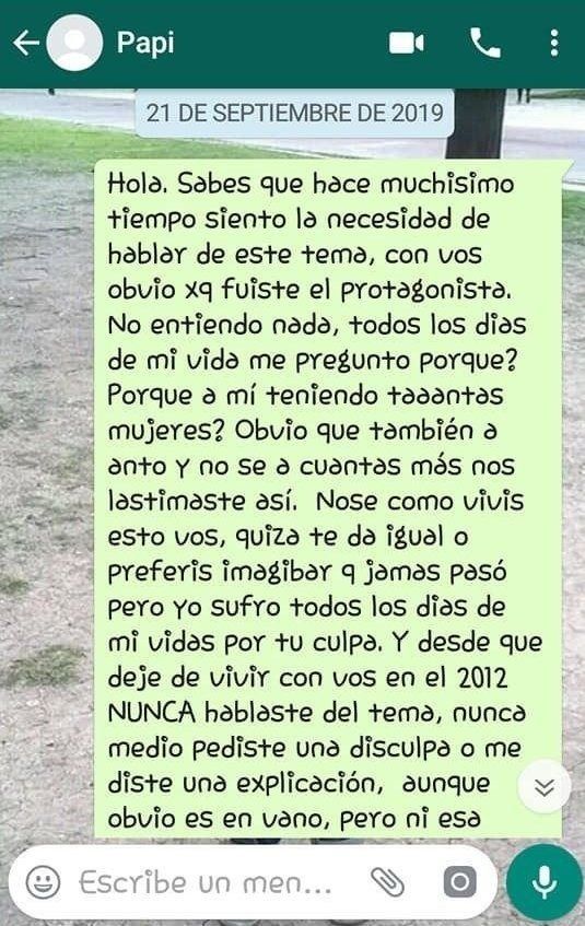 “La otra cara de la pandemia es el sufrimiento de todas las personas que esperamos un poco de Justicia Argentina. Teniendo todas las pericias realizadas tanto mi hermana como yo, teniendo los mensajes y el video del llamado donde admite todo. Teniendo otra denunciante más, sí, tres denuncias hacia la misma persona”, disparó por su perfil de Facebook. Lo reabrió pocos días antes del inicio del aislamiento y recibió decenas de mensajes con relatos similares al suyo. Y así decidió volver a la carga contra su progenitor.