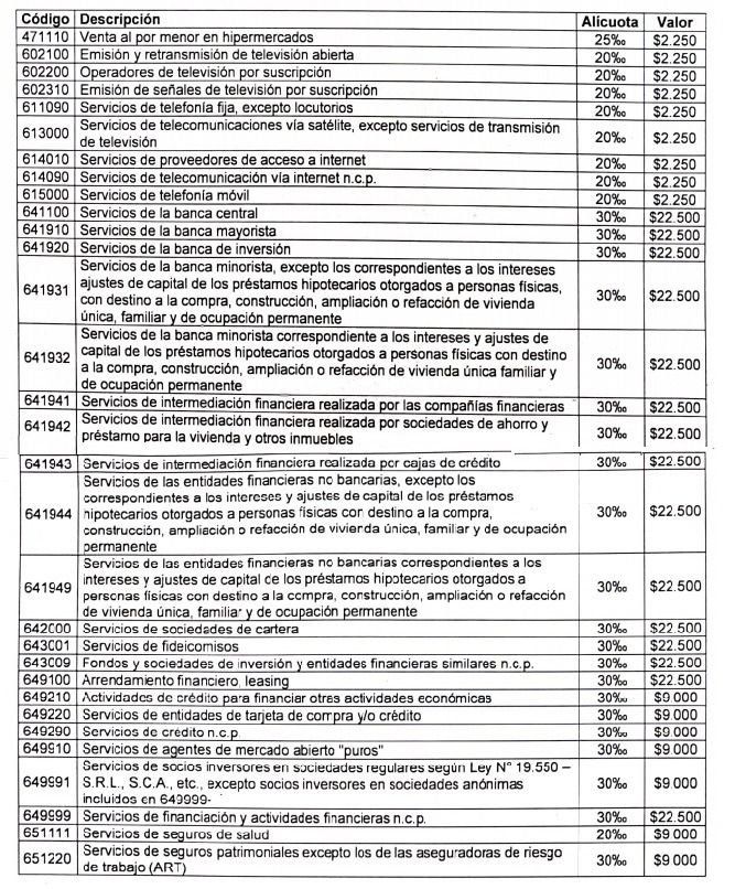 Esos ajustes representarán para los contribuyentes subas que oscilaran entre el 20 y el 100 por ciento. Entre las actividades que percibirán más impacto están la emisión y transmisión de televisión abierta y por suscripción, las telecomunicaciones vía satélite, los provisión del servicio y la telecomunicación a través de internet. En todos los casos la alícuota se duplica (en términos nominales será del 100%): pasa del 10 al 20 por mil.