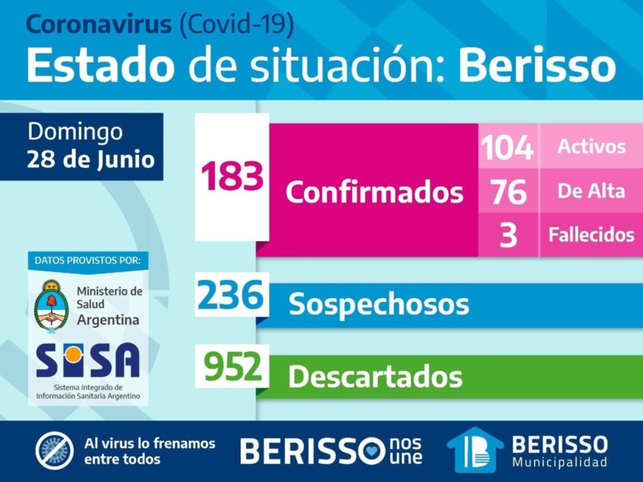 En tanto, en la localidad de Berisso este domingo se registraron once nuevos casos de coronavirus, seis fueron dados de alta, 15 aún están en estudio y 17 fueron descartados. De esta manera, el Municipio tiene 183 casos confirmados (104 activos, 76 con alta médica y tres fallecidos), 952 casos descartados y 236 casos sospechosos.