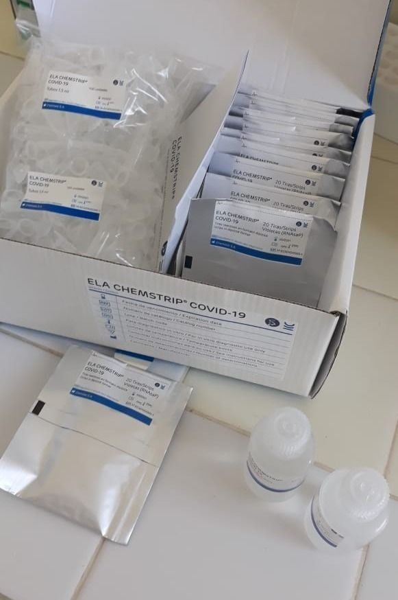 En relación al segundo test denominado Ela-Chemstrip, a través de una acción coordinada entra las Universidades Nacionales de San Martín y de Quilmes y el Ministerio de Salud de la Provincia de Buenos Aires, se entregaron determinaciones en el hospital San Juan de Dios y otros nosocomios de del Área Metropolitana de Buenos Aires (AMBA).