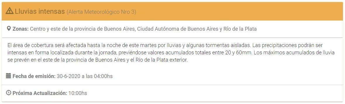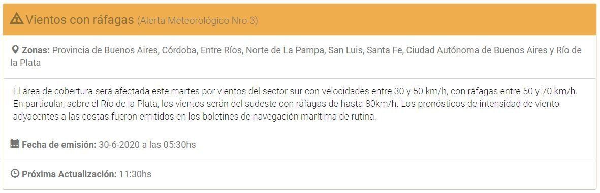 Los especialistas también emitieron un aviso ante los pronósticos de vientos de entre 30 y 50 kilómetros por hora, con ráfagas entre los 50 y 70 kilómetros por hora y picos de hasta 80 kilómetros por hora en sobre el Río de la Plata.