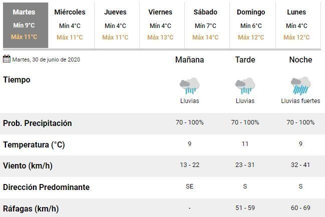 Sobre la temperatura agregaron que se espera una mínima en torno a los 9°C y una máxima que podría alcanzar unos frescos 11°C.