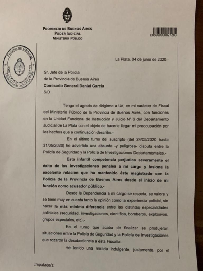 El fiscal sostuvo que advirtió "una absurda –y peligrosa– disputa entre la Policía de Seguridad y la Policía de Investigaciones Departamentales". "Esta infantil competencia perjudica severamente el éxito de las investigaciones penales a mi cargo y lesiona la excelente relación que ha mantenido este magistrado con la Policía de la Provincia de Buenos Aires desde el inicio de su función como acusador público", expresó Romero en el escrito.