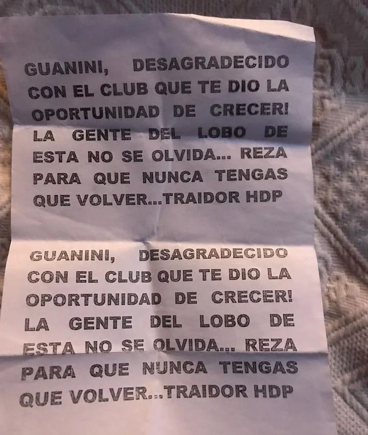 El futbolista de 24 años, ha sido señalado en el último tiempo por no haber acordado su continuidad en Gimnasia y quedar con el pase en su poder el próximo 31 de junio. "Guanini, desagradecido con el club que te dio la posibilidad de crecer. La gente del Lobo de ésta no se olvida. Rezá para que nunca tengas que volver traidor hdp", dice parte del mensaje que llegó a manos del jugador.