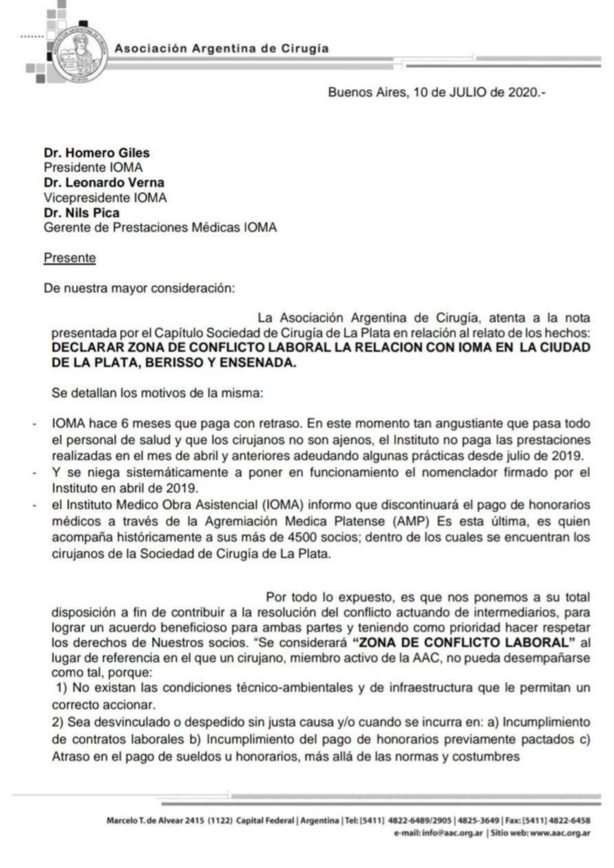 En medio de la polémica desatada entre los médicos de la Agremiación Médica Platense (AMP) y el Instituto de Obra Médico Asistencial (IOMA), la Asociación Argentina de Cirugía envió una carta a las autoridades provinciales para apoyar el reclamo de los médicos, ofrecerse como "intermediario" para la resolución del conflicto y declaró a La Plata, Berisso y Ensenada como una zona de "conflicto laboral".