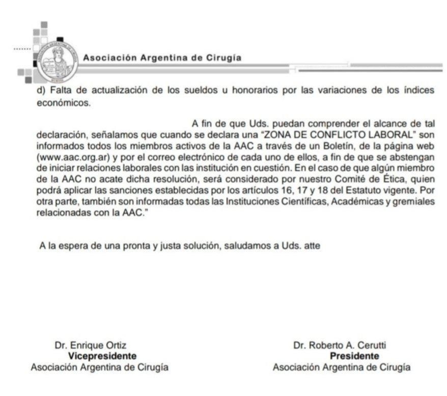 De acuerdo con el escrito, la declaración se da en aquellos casos en que los cirujanos miembros de la Asociación no puedan desempeñarse en base a dos razones: porque no existen las condiciones técnicas, ambientales o de infraestructura para hacerlo, o bien haya sido despedido sin causa justa, se incumplan contratos laborales, no se realice el pago de honorarios pactados, haya un retraso en ese pago o no se actualicen los mismos de acuerdo a la variación de los índices económicos.