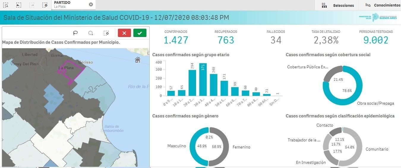 En las estadísticas para La Plata se informa también que los testeados fueron 9.002 personas y que la tasa de letalidad es del 2,38%. En tanto que la distribución entre varones y mujeres sigue siendo pareja y el contagio comunitario es ampliamente mayoritario: el 54% de los casos fue por esa vía.