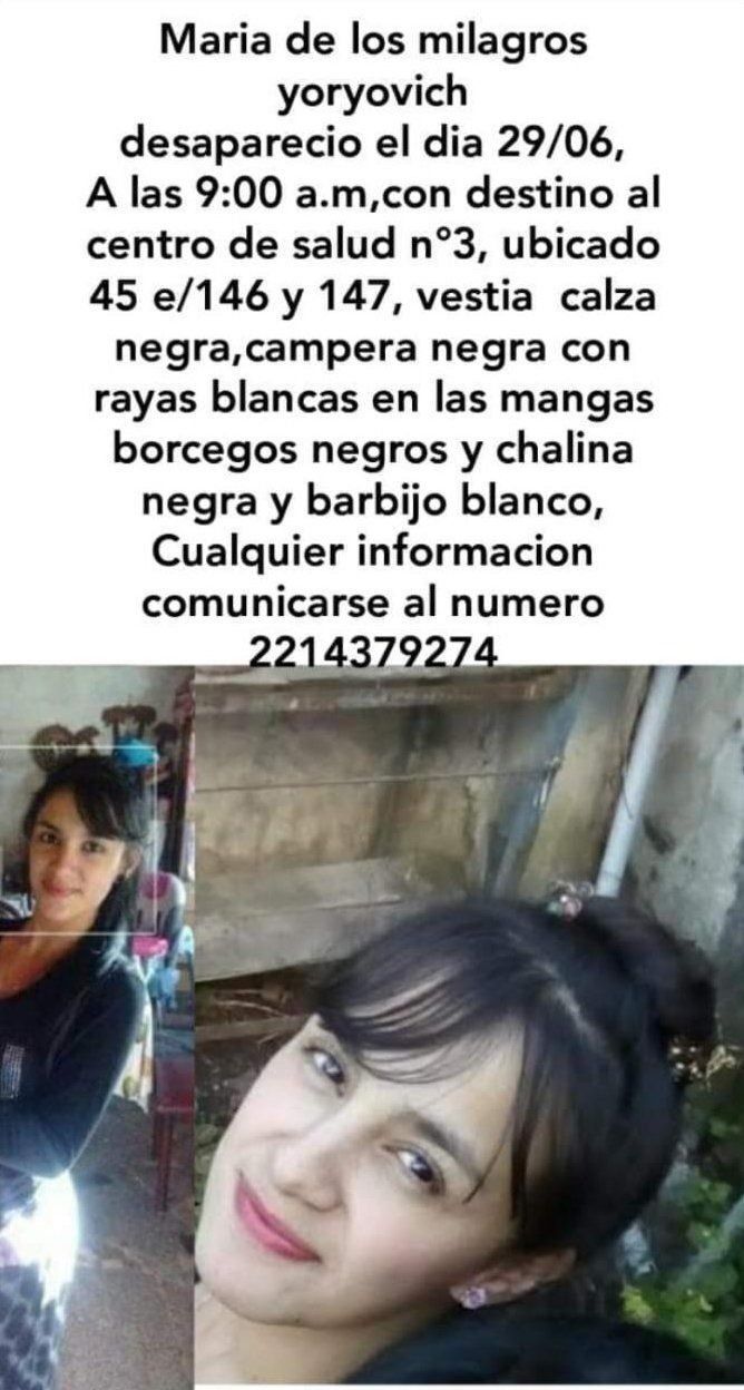 El día que desapareció, Milagros vestía una calza negra, campera negra con rayas blancas en las mangas, borcegos negros, una chalina del mismo color y barbijo blanco. Quienes tengan alguna información deben comunicarse al 911 o llamar al 2214379274. También pueden contactar a sus familiares Celeste Yoryovich y Graciela Petrini en Facebook.