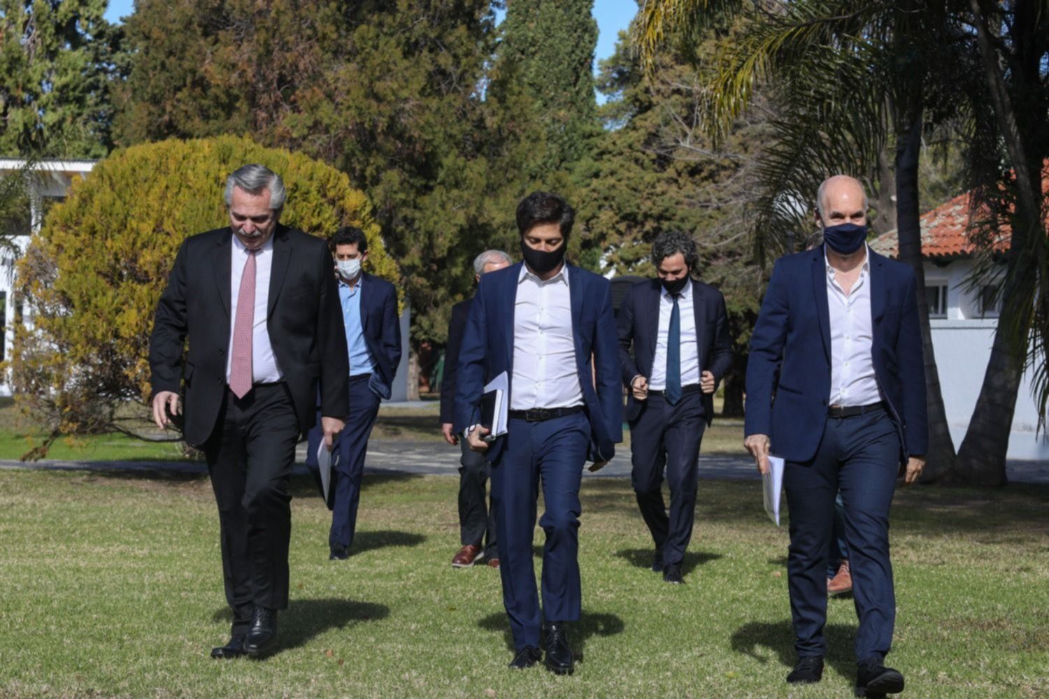 Junto al gobernador Axel Kicillof, el jefe de Gobierno porteño Horacio Rodríguez Larreta y los gobernadores Jorge Capitanich (Chaco), Gerardo Morales (Jujuy) y Arabela Carreras (Río Negro), el Presidente hizo un repaso de la situación que atraviesa el país y aseguró: "Entre el 18 de julio y el 2 de agosto vamos a ir tratando de volver a la vida habitual en este nuevo mundo. Y lo vamos hacer escalonadamente".