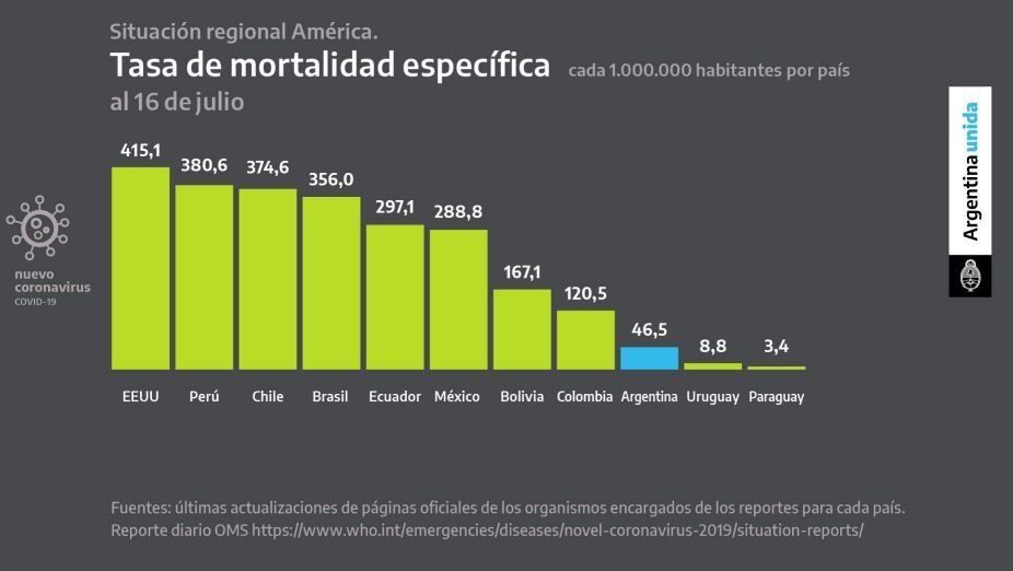 En esa línea, el Presidente resaltó que Argentina es uno de los países del continente con la tasa de mortalidad más baja con 46,5 personas fallecidas por cada un millón de habitantes. Solo tiene por detrás a Uruguay con 8,8 y Paraguay con 3,4.