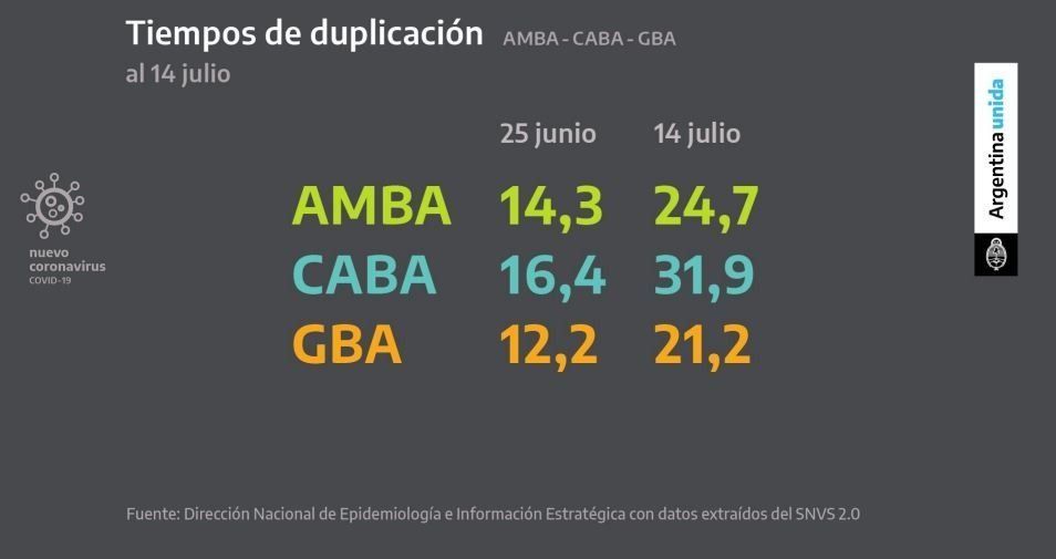 Estos resultados son más alentadores en el AMBA, donde el tiempo de duplicación de contagios pasó de 14,3 a 24,7, entre el 25 junio y 14 de julio. En Ciudad Autónoma de Buenos Aires (CABA) de 16, 4 a 31,9, en el mismo período. En el Gran Buenos Aires (GBA), de 12,2 a 21,2.