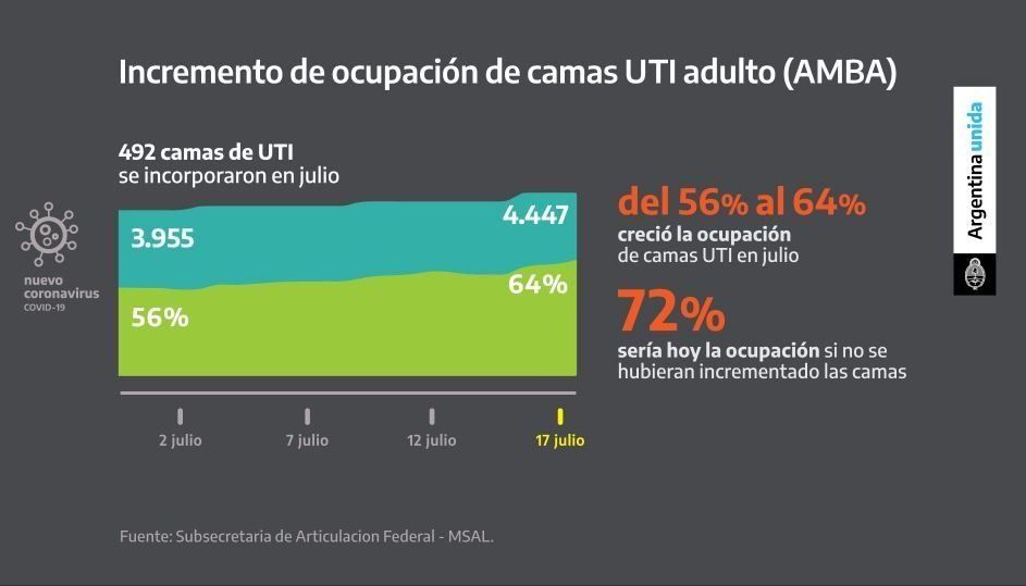 En cuanto al incremento de ocupación de unidades de terapia intensiva (UTI) en el AMBA, pasó del 56% al 64% en lo que va de julio. En ese sentido, el Presidente destacó el trabajo para nutrir de elementos al sistema de salud. De acuerdo a los datos difundidos, si no se hubieran entregado las 492 camas en julio, el porcentaje de ocupación hubiese alcanzado el 72%.
