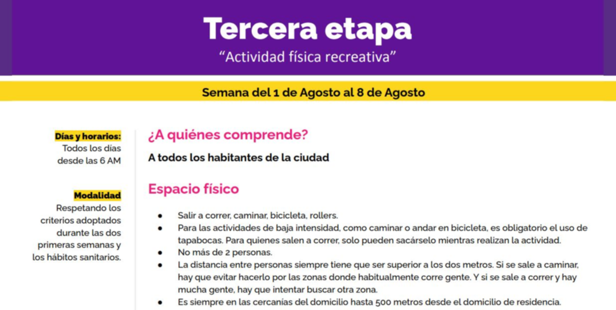 La tercera fase del plan contempla la actividad física recreativa, permitida para toda la población de la ciudad y que prevé las salidas a correr, caminar, a andar en bicicleta o rollers. De acuerdo a lo informado por las autoridades municipales, se pondrá en marcha en la semana del 1 al 8 de agosto. Sin embargo, aclararon que la habilitación de estás actividades dependerá exclusivamente de cómo avance la curva de contagios en la ciudad. Es decir: si los contagios se duplican en un tiempo menor respecto de la situación actual, habrá que seguir esperando.