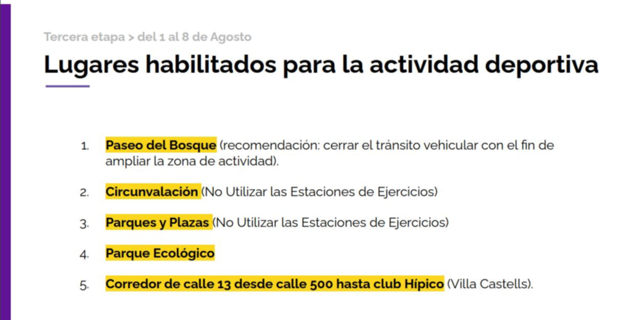 Otro punto fundamental es que se debe practicar en los espacios cercanos a cada casa: la distancia máxima es de 500 metros desde el domicilio de residencia. Hasta el momento los lugares que la Municipalidad habilitó para la actividad deportiva son el Paseo del Bosque -donde se cerrará el tránsito-, Circunvalación, parques y plazas, el Parque Ecológico y el corredor de calle 13 desde 500 hasta el Club Hípico en Villa Castells.