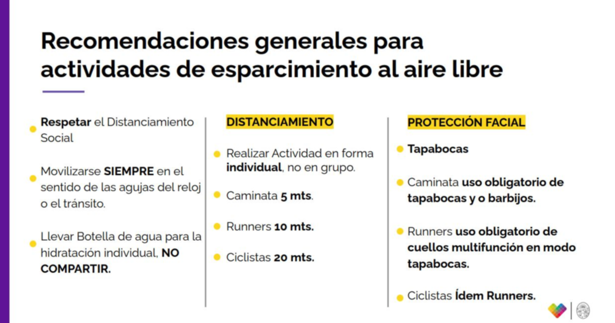 Entre las recomendaciones para las actividades de esparcimiento al aire libre se cuentan movilizarse siempre en el sentido de las agujas del reloj o el tránsito, como así también llevar botella de agua para la hidratación individual que no debe compartirse. En cuanto a las distancias, en la caminata la separación debe ser de 5 metros, en el running de 10 y en el ciclismo de 20.