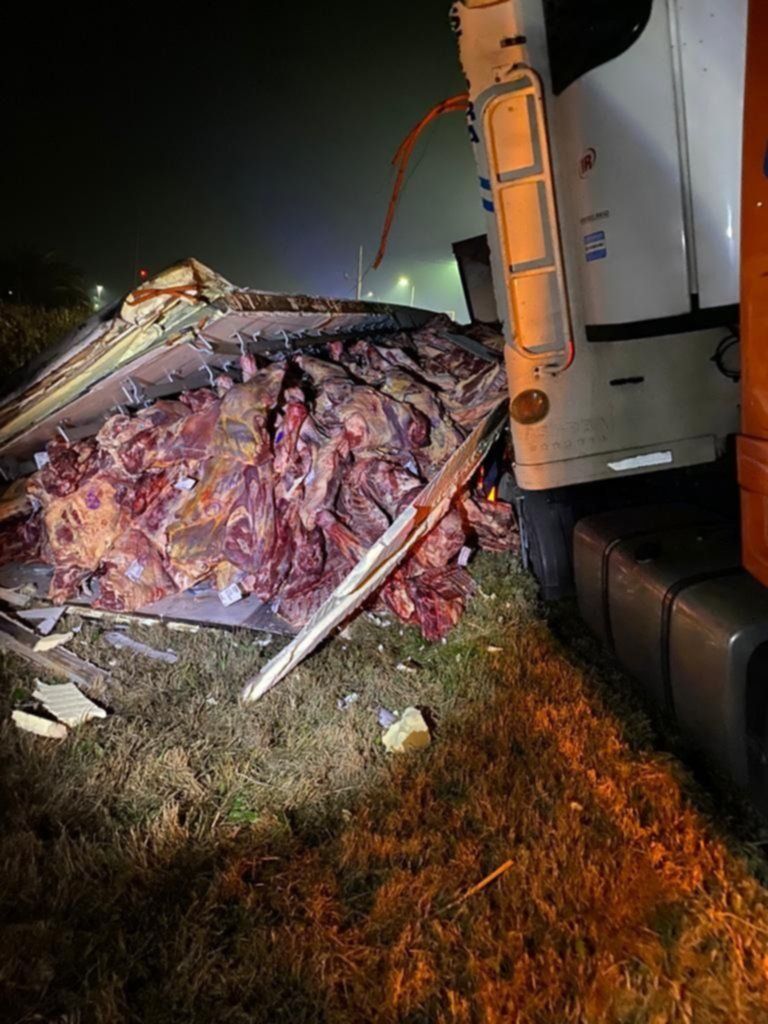 Según informaron fuentes oficiales, un camión que transportaba 17 mil kilos de carne volcó sobre el trazado, quedando en medio de la calle y desparramando gran parte de su carga.
