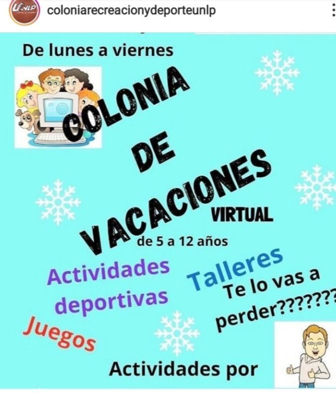 Destinada a niños de entre 5 y 12 años, la Colonia Virtual ofrecerá de lunes a viernes una gran variedad de talleres entre los que se podrán elegir cocina, música, movimiento, malabares, reciclado, manualidades, danzas y además, los pequeños colonos podrán realizar diferentes juegos deportivos. La experiencia culminará con un divertido campamento virtual.