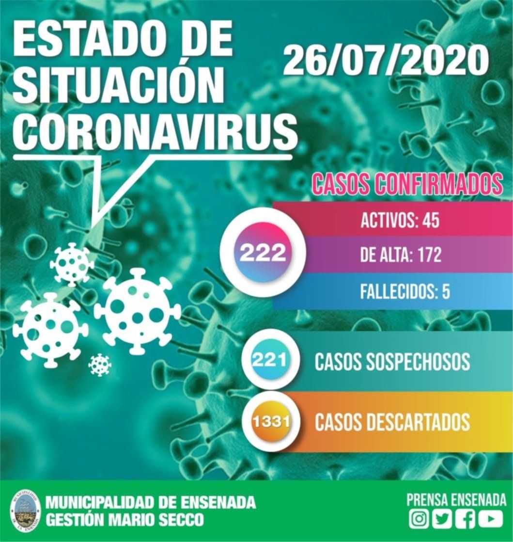 De esta manera, la ciudad acumula 45 activos de Covid19, 172 dados de alta, 5 fallecidos, 221 en análisis y 1331 descartados. De los positivos activos: 18 pertenecen a barrios de El Dique, 17 a barrios de Ensenada Centro y 10 a barrios de Punta Lara.