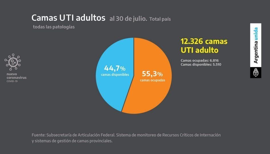 El Presidente también destacó que el sistema de salud está "cumpliendo". "Si no hubiésemos duplicado las camas de terapia intensiva, la provincia de Buenos Aires estaría explotada", sostuvo. De acuerdo con los datos, en todo el país hay 12.326 unidades de terapia intensiva (UTI) de las cuales el 55,3% están ocupadas y el 44,7% están disponibles.