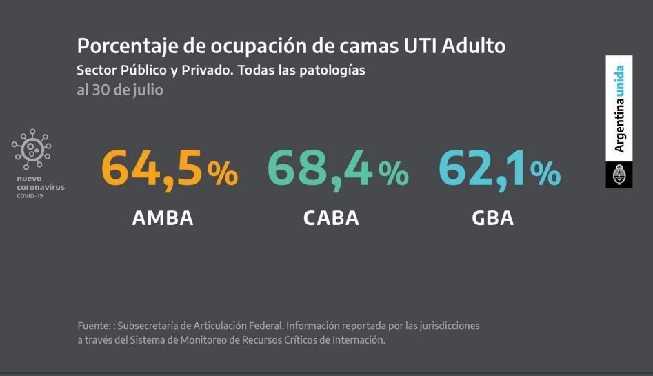 Sin embargo, en el AMBA ese porcentaje asciende a 64,5%; en CABA a 68,4% (sobre este punto Larreta afirmó que incorporaron 50 camas más); y en GBA de 62,1%.