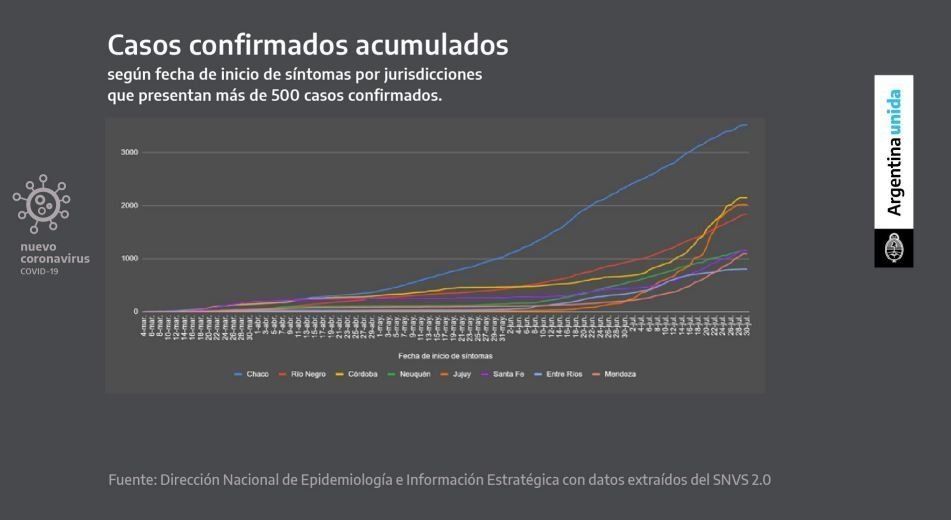 La gráfica de los casos confirmados acumulados, según fecha de inicio de síntomas por jurisdicciones que presentan más de 500 casos confirmados, se puede observar cómo en el Chaco y otras provincias se disparó la curva de contagios.