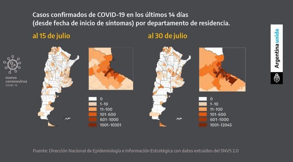 En otro de los pasajes de su exposición, el Presidente manifestó que “el problema ha comenzado a irradiarse a otras provincias” y remarcó que “el foco es el AMBA” pero el virus empezó a circular con mayor velocidad en Jujuy, Rio Negro y Chaco. En las imágenes se puede observar cómo otras regiones del país que estaban en blanco el 15 de julio, ahora están coloreadas con distintas tonalidades de naranjas, que reflejan el aumento de casos.