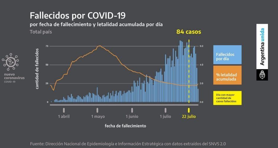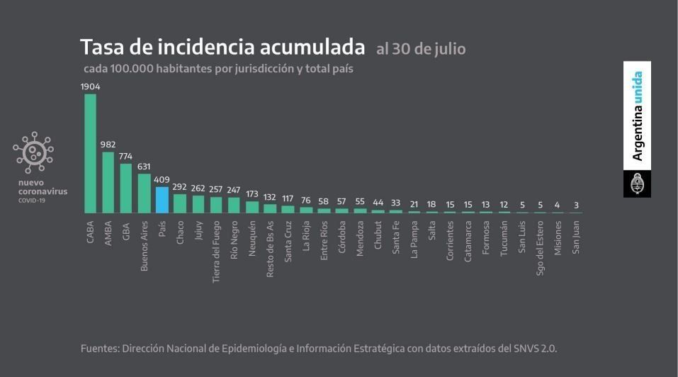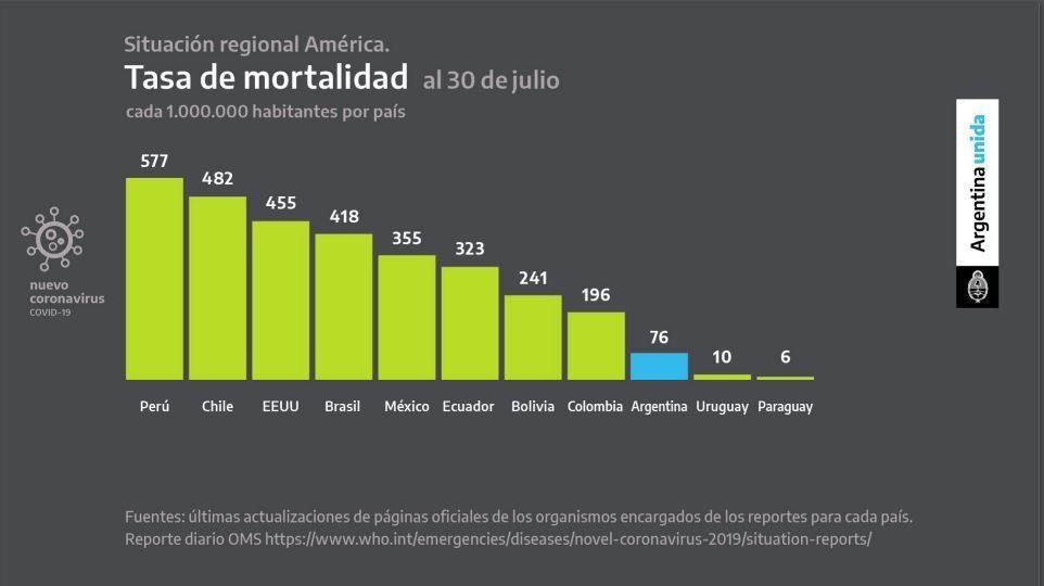 En ese marco, el Presidente destacó que Argentina sigue siendo uno de los países con menor tasa de mortalidad con 76 personas fallecidas por cada un millón de habitantes hasta el 30 de julio. Solo tiene por detrás a Uruguay con 10 y Paraguay con 6. Este dato encendió las alarmas de las autoridades sanitarias ya que el 17 de julio era de 46,6.