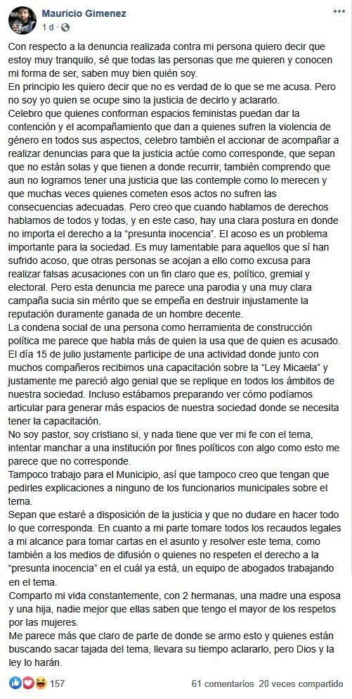 En un extenso escrito, el acusado negó el hecho y afirmó que reconoce y respeta la lucha feminista para dar contención a quienes sufren violencia de género, pero dijo que en esta ocasión el acoso fue usado con un fin "político" para perjudicarlo.