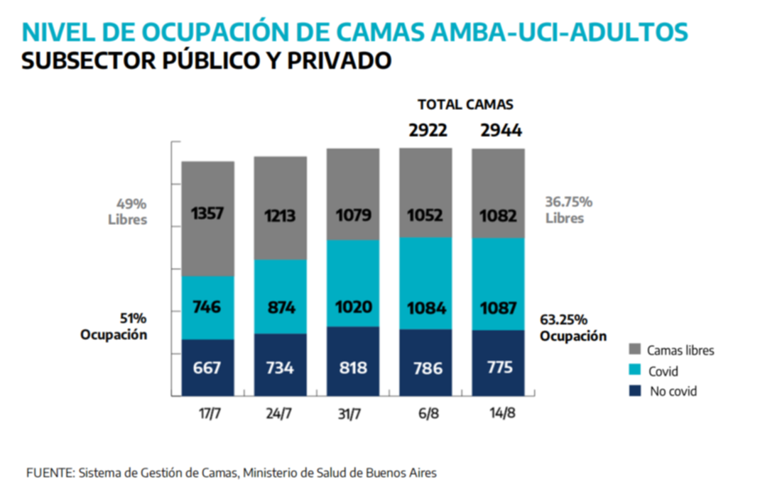 La medida incluye un aporte del gobierno nacional para proveer a las terapias intensivas de las clínicas y sanatorios entre dos y tres camas con sus correspondientes equipamientos, con lo cual aumentará la capacidad general. Para justificarlo, Gollan expuso la evolución en aumento de la ocupación de plazas de cuidado crítico a lo largo de las semanas.