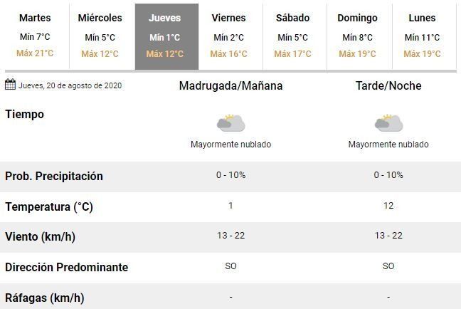 En esa misma línea los expertos argentinos explicaron que se espera un día con nubosidad en aumento y vientos leves rotando del noroeste al sur y agregaron que esta será la antesala de un fuerte descenso de la temperatura para lo que resta de la semana.