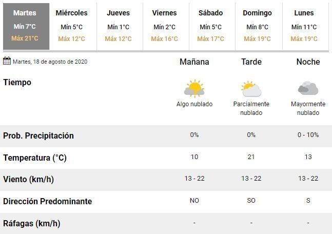 Aunque el martes comenzó con una mínima en torno a los 7°C, los especialistas del Servicio Meteorológico Nacional (SMN) adelantaron que la temperatura irá en aumento a lo largo de la jornada y se espera una máxima que podría llegar a unos cálidos 21°C.