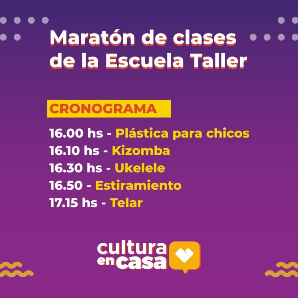 Este sábado llega la maratón de cursos virtuales de la Escuela Taller Municipal de Arte. Se trata de una propuesta que invita a los platenses a participar de distintas actividades artísticas de forma online y gratuita en el marco del programa "Cultura en casa". Según precisaron en la Comuna, los vecinos podrán disfrutar de una sucesión de actividades artísticas para todas las edades, que incluyen clases de plástica para niños, kizomba, ukelele, estiramiento y telar.