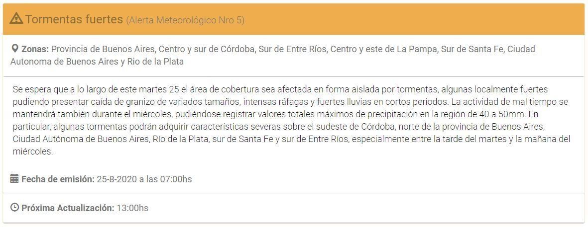 Según se lee en la alerta emitida por las autoridades, algunas tormentas podrían ser "localmente fuertes" y hasta "presentar caída de granizo de variados tamaños, intensas ráfagas y fuertes lluvias en cortos periodos".