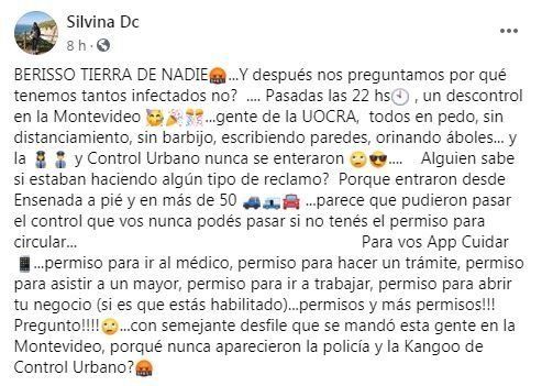 Notoriamente indignada por la situación, la mujer realizó un extenso posteo en su cuenta de Facebook para manifestar su preocupación por las consecuencias que pueden tener estos festejos que se desataron en plena vía pública, más precisamente sobre la calle Montevideo.